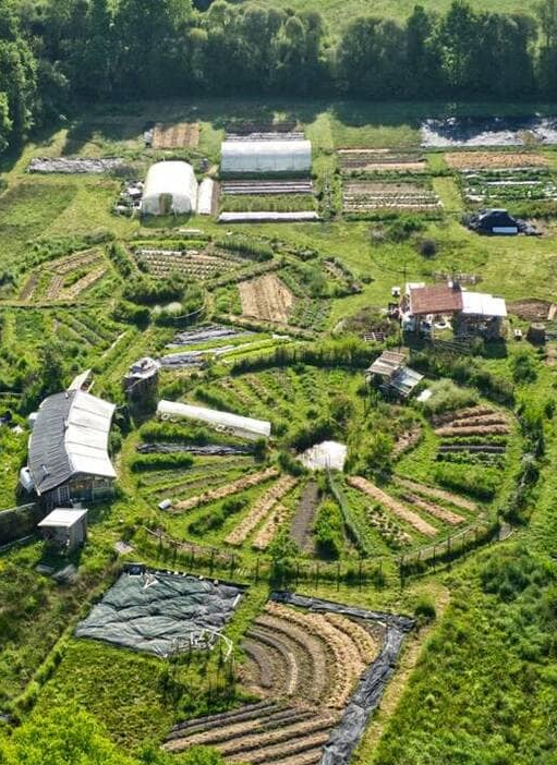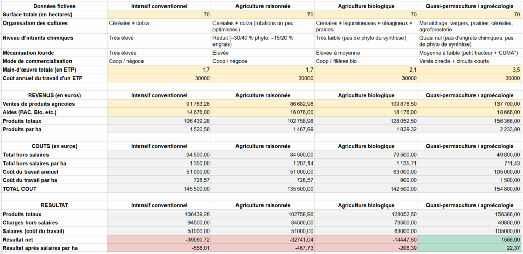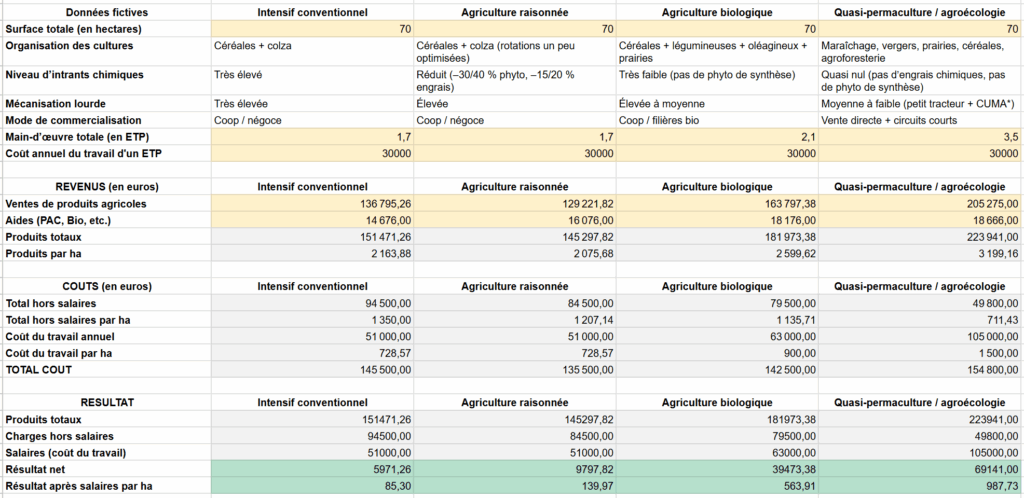 La permaculture : il serait peu réaliste d’utiliser une exploitation permacole de 70 ha dans nos calculs car c’est peu probable. Ce modèle diversifie beaucoup ses productions : maraîchage intensif en planches permanentes (ça ne vous parle peut-être pas les « planches », en gros c’est une rangée de terre un peu surélevée sur laquelle on plante, qu’on couvre, on prend soin du sol, etc.), vergers, prairies, élevage extensif, céréales et agroforesterie par exemple. Là, on n’utilise quasiment aucun intrant, la mécanisation lourde est réduite au minimum, et on diversifie aussi ses canaux de vente pour ne pas dépendre que des géants qui tirent les prix vers le bas (vente en direct, produits transformés localement, circuits courts…). Ce modèle nécessite plus de main-d’œuvre, c’est certain, et change beaucoup les pratiques mais nous verrons que ce n’est pas forcément une mauvaise chose.