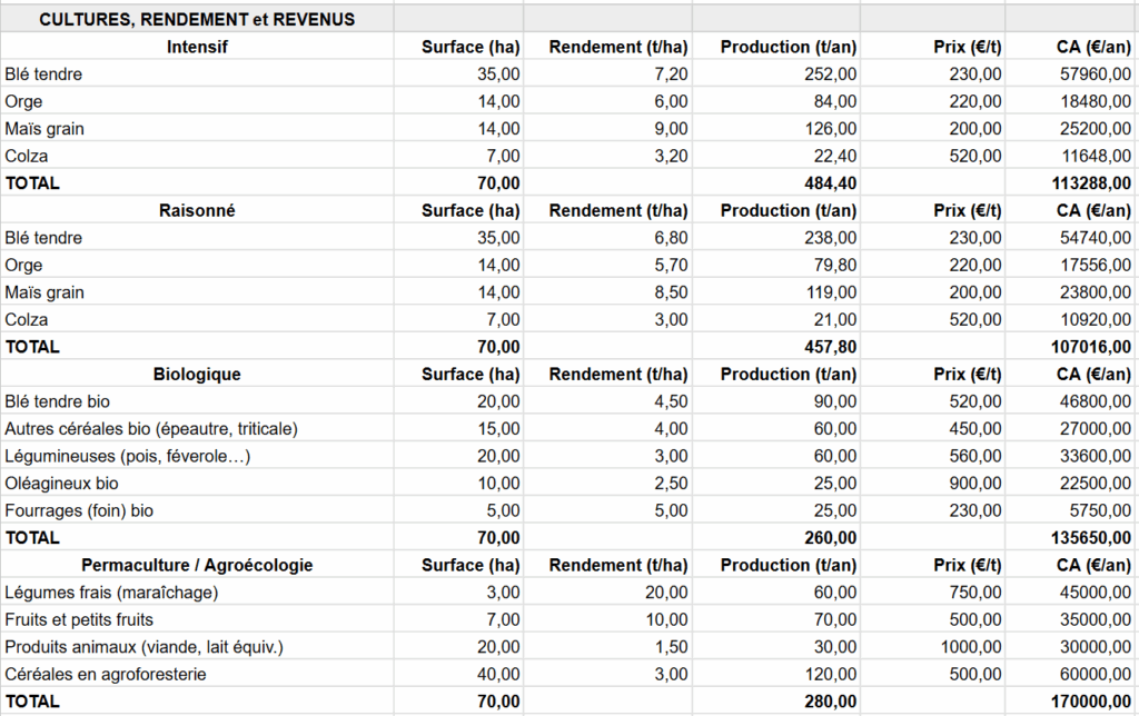 Pour les mauvaises années, je baisse les rendements de 10% et le prix de vente de 10%, ce qui fait que même le bio souffre (mais la permaculture reste positive, de peu, mais positive).