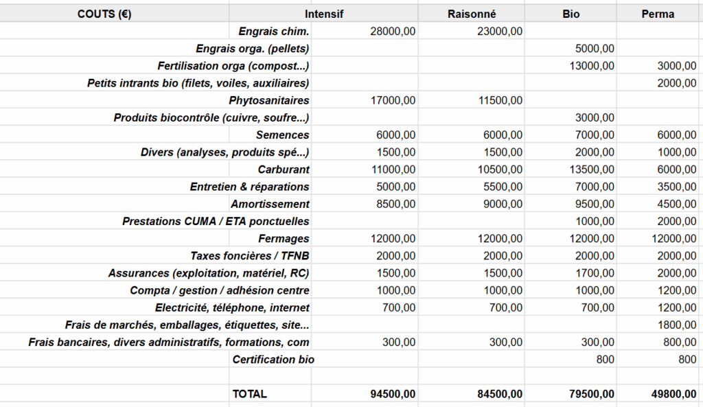 • le foncier (si on possède la terre) ou le fermage (si on la loue) et taxes associées