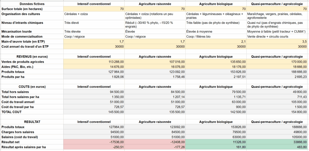 Avec ces données que j’ai pu glaner ici et là(Insee, Ministère de l’Agriculture, Agreste recensement agricole, Terre-net, Mouvement Colibris, Actu-environnement, etc.) pour avoir des moyennes à peu près réalistes (en tout cas je l’espère), j’ai pu faire ce tableau comparatif des modèles agricoles pour une année moyenne (ni bonne ni mauvaise).