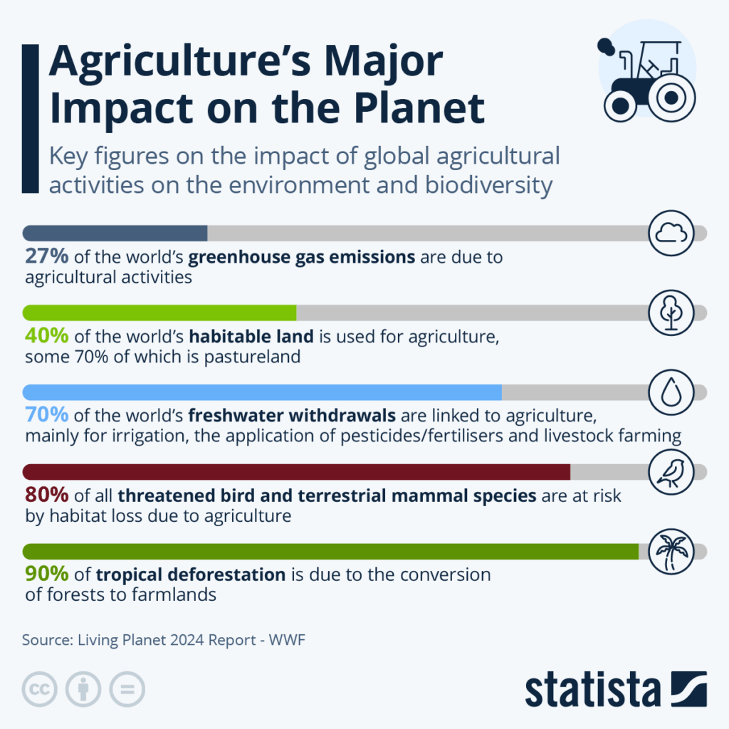 L’élevage représente 14,5% des émissions mondiales (FAO 2013), plus que tous les transports. 70% des terres agricoles mondiales servent à nourrir les animaux d’élevage (pâturages + cultures fourragères) pour seulement 18% des calories humaines. 80% de la déforestation amazonienne est liée à l’élevage bovin ou à la culture de soja pour l’alimentation animale.