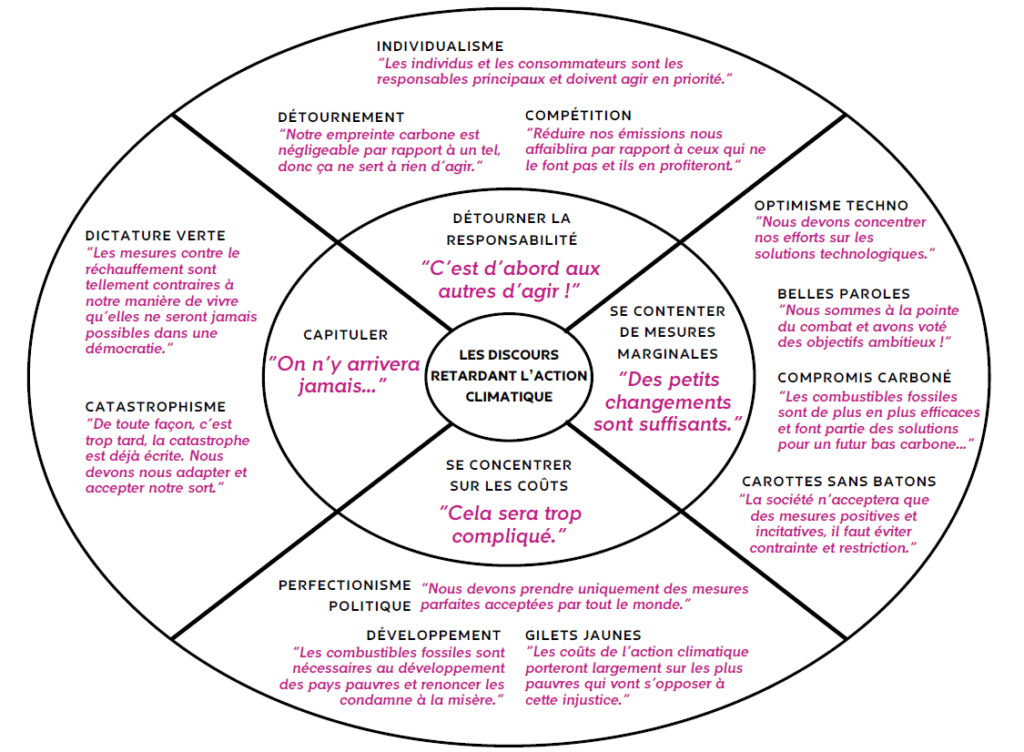 Si ça vous rappelle quelque chose, c’est normal, ces 4 méthodes font partie du super graphique des discours d’inaction climatique, inclus dans l’étude de Cambridge, qu’on retrouve traduit en français dans mon bouquin solarpunk (gratuit, p.80):